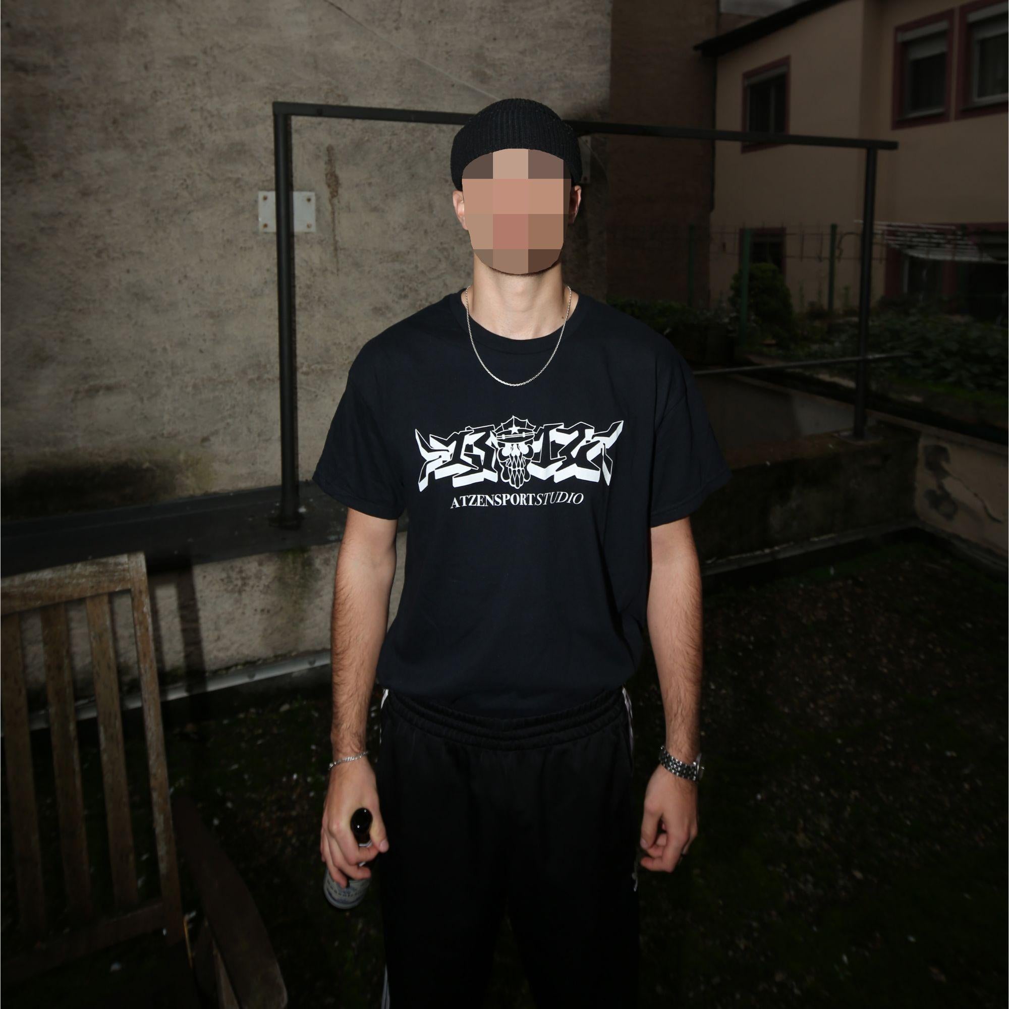 A Länge: Platziere das Ende des Bandes neben dem Kragen am oberen Ende des T-Shirts (Höchster Punkt Schulter). Ziehe das Maßband bis zum unteren Ende des T-Shirts.